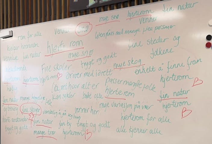 Alle i klassen kom med to ting de liker ved Elverum, som ble skrevet opp på tavla