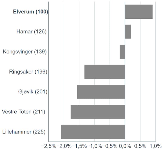 Den relative veksten i antall arbeidsplasser i Elverum er bedre enn kommuner vi sammenlikner oss med. Tabellen under viser at for 2020 og 2021 har Elverum klart seg bedre enn andre kommuner. Relativ vekst er forskjellen mellom veksten i kommunene og veksten på landsbasis, og her ligger Elverum på plass nummer 100 av alle kommuner i landet.